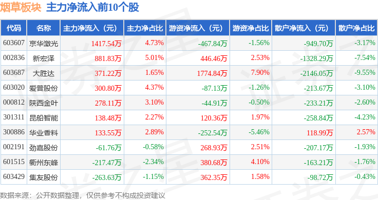 从资金流向上来看,当日烟草板块主力资金净流出9.77亿元,游资资金净流入1.58亿元,散户资金净流入8.19亿元。烟草板块个股资金流向见下表: