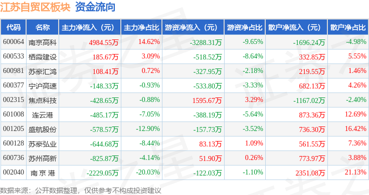 从资金流向上来看,当日江苏自贸区板块主力资金净流出61.7万元,游资资金净流出3605.82万元,散户资金净流入3667.52万元。江苏自贸区板块个股资金流向见下表: