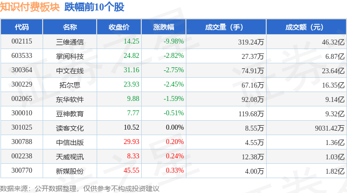 证券之星消息,1月20日知识付费板块较上一交易日下跌0.3%,三维通信领跌。当日上证指数报收于4113.65,下跌0.01%。深证成指报收于14155.63,下跌0.97%。知识付费板块个股涨跌见下表: