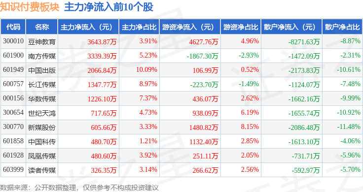 从资金流向上来看,当日知识付费板块主力资金净流出7.61亿元,游资资金净流入3.45亿元,散户资金净流入4.16亿元。知识付费板块个股资金流向见下表: