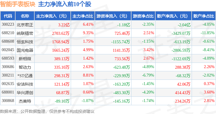 从资金流向上来看,当日智能手表板块主力资金净流出30.13亿元,游资资金净流入6.38亿元,散户资金净流入23.75亿元。智能手表板块个股资金流向见下表: