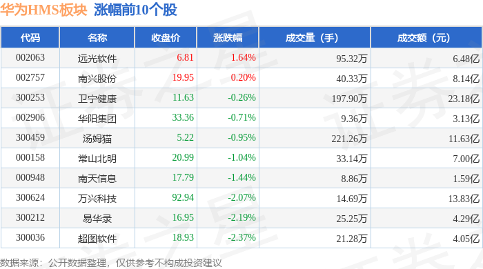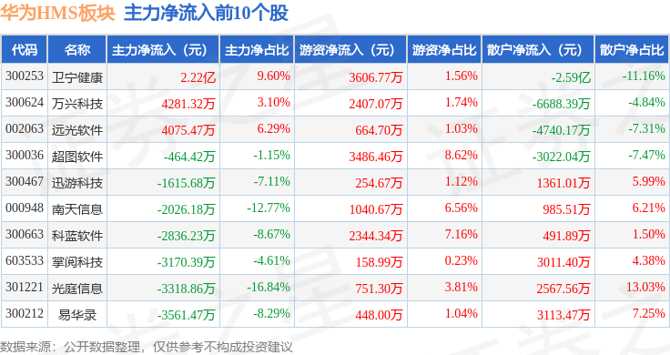 从资金流向上来看,当日华为HMS板块主力资金净流出12.74亿元,游资资金净流入4.29亿元,散户资金净流入8.45亿元。华为HMS板块个股资金流向见下表: