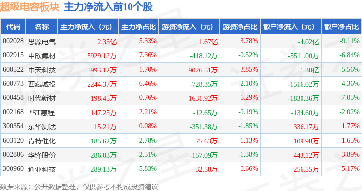 从资金流向上来看,当日超级电容板块主力资金净流出14.14亿元,游资资金净流入4.85亿元,散户资金净流入9.29亿元。超级电容板块个股资金流向见下表: