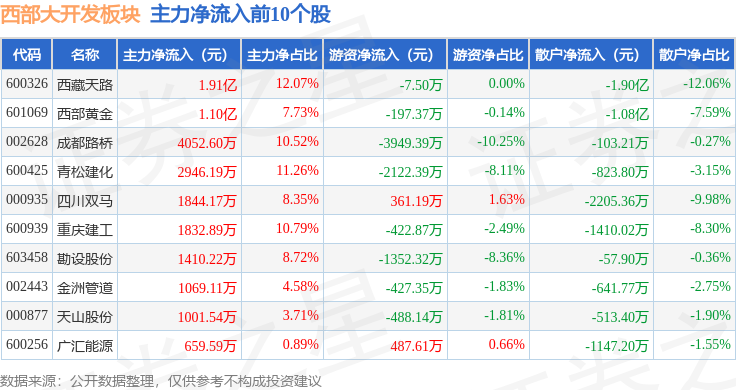 从资金流向上来看,当日西部大开发板块主力资金净流出20.77亿元,游资资金净流入5.91亿元,散户资金净流入14.86亿元。西部大开发板块个股资金流向见下表: