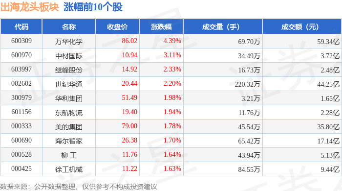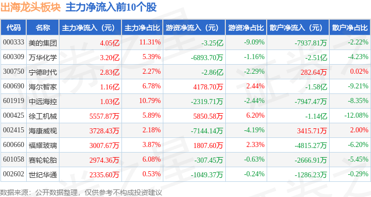 从资金流向上来看,当日出海龙头板块主力资金净流出102.65亿元,游资资金净流入27.34亿元,散户资金净流入75.31亿元。出海龙头板块个股资金流向见下表: