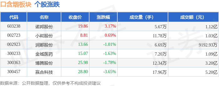 证券之星消息,1月20日口含烟板块较上一交易日下跌1.95%,赢合科技领跌。当日上证指数报收于4113.65,下跌0.01%。深证成指报收于14155.63,下跌0.97%。口含烟板块个股涨跌见下表: