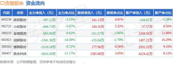 从资金流向上来看,当日口含烟板块主力资金净流出1.22亿元,游资资金净流入2386.72万元,散户资金净流入9861.99万元。口含烟板块个股资金流向见下表: