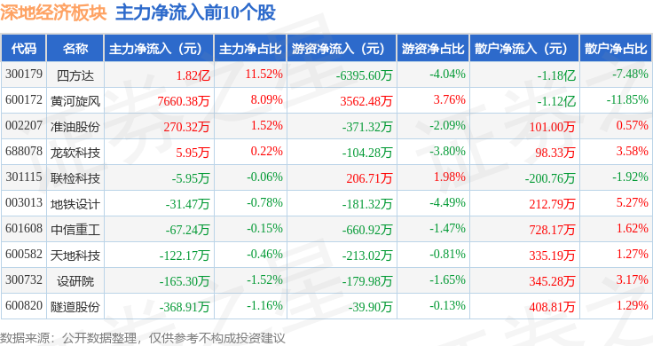 从资金流向上来看,当日深地经济板块主力资金净流出1.34亿元,游资资金净流出5845.45万元,散户资金净流入1.93亿元。深地经济板块个股资金流向见下表: