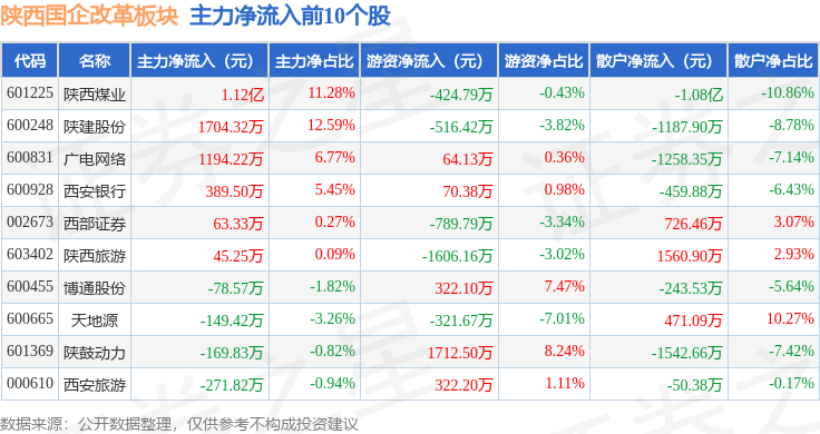 从资金流向上来看,当日陕西国企改革板块主力资金净流出11.09亿元,游资资金净流入2.67亿元,散户资金净流入8.42亿元。陕西国企改革板块个股资金流向见下表: