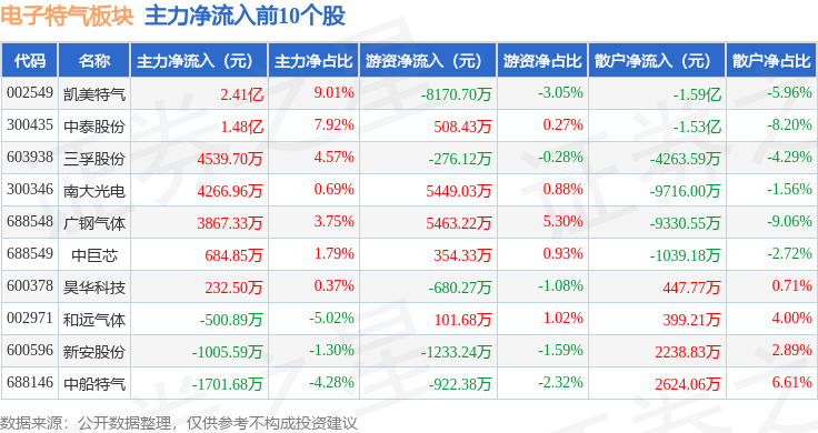 从资金流向上来看,当日电子特气板块主力资金净流入1.42亿元,游资资金净流入1.48亿元,散户资金净流出2.9亿元。电子特气板块个股资金流向见下表: