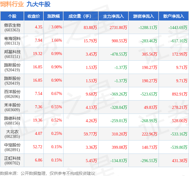 个股表现方面,饲料行业当日领涨股为傲农生物(603363),该股当日报收4.35,上涨3.08%,成交量83.88万,主力资金净流入2731.8万元。粤海饲料(001313)以上涨1.66%紧随其后,该股当日成交量15.79万,主力资金净流入900.55万元。除此之外,邦基科技(603151)、路斯股份(920419)、路斯股份(920419)均进入当日牛股之列。具体个股列表见下表: