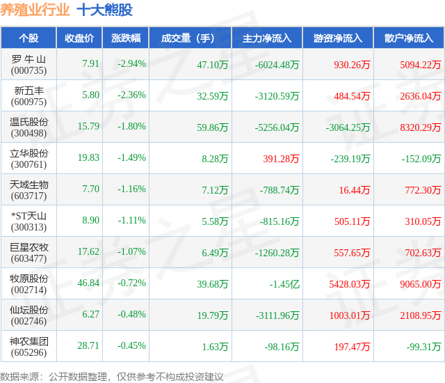 个股表现方面,养殖业行业当日领跌股为罗 牛 山(000735),该股当日报收7.91,下跌2.94%,成交量47.1万,主力资金净流出6024.48万元。新五丰(600975)以下跌2.36%紧随其后,该股当日成交量32.59万,主力资金净流出3120.59万元。除此之外,温氏股份(300498)、立华股份(300761)、天域生物(603717)均进入当日熊股之列。具体个股列表见下表: