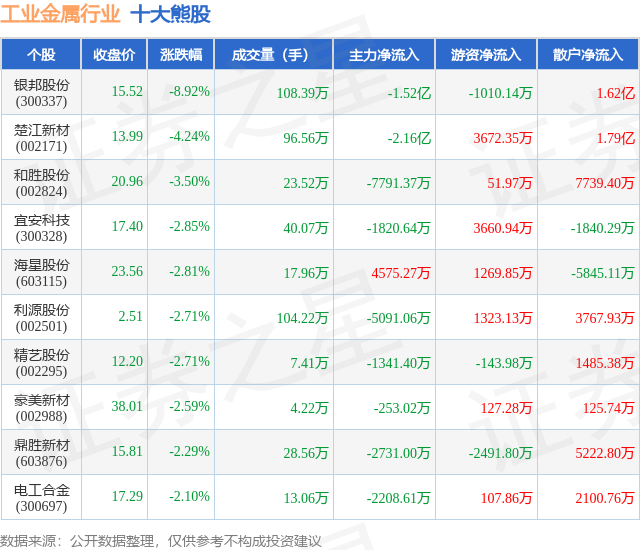 个股表现方面,工业金属行业当日领跌股为银邦股份(300337),该股当日报收15.52,下跌8.92%,成交量108.39万,主力资金净流出1.52亿元。楚江新材(002171)以下跌4.24%紧随其后,该股当日成交量96.56万,主力资金净流出2.16亿元。除此之外,和胜股份(002824)、宜安科技(300328)、海星股份(603115)均进入当日熊股之列。具体个股列表见下表: