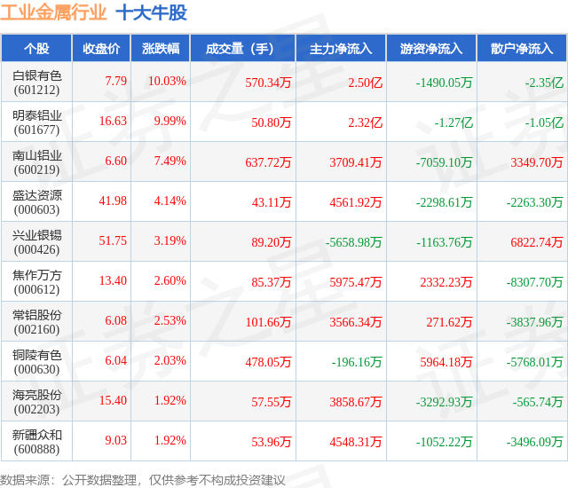 个股表现方面,工业金属行业当日领涨股为白银有色(601212),该股当日报收7.79,上涨10.03%,成交量570.34万,主力资金净流入2.5亿元。明泰铝业(601677)以上涨9.99%紧随其后,该股当日成交量50.8万,主力资金净流入2.32亿元。除此之外,南山铝业(600219)、盛达资源(000603)、兴业银锡(000426)均进入当日牛股之列。具体个股列表见下表: