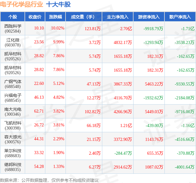 个股表现方面,电子化学品行业当日领涨股为西陇科学(002584),该股当日报收10.1,上涨10.02%,成交量123.81万,主力资金净流入2.7亿元。江化微(603078)以上涨9.99%紧随其后,该股当日成交量3.72万,主力资金净流入4832.17万元。除此之外,凯华材料(920526)、凯华材料(920526)、广钢气体(688548)均进入当日牛股之列。具体个股列表见下表:
