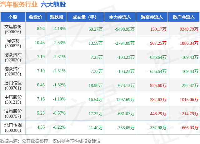 个股表现方面,汽车服务行业当日领跌股为交运股份(600676),该股当日报收8.94,下跌4.18%,成交量60.27万,主力资金净流出9498.95万元。阿尔特(300825)以下跌2.33%紧随其后,该股当日成交量13.59万,主力资金净流出2794.09万元。除此之外,德众汽车(920030)、德众汽车(920030)、厦门信达(000701)均进入当日熊股之列。具体个股列表见下表: