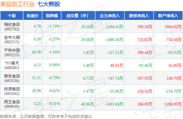 个股表现方面,食品加工行业当日领跌股为海欣食品(002702),该股当日报收6.78,下跌1.74%,成交量29.26万,主力资金净流出2264.1万元。金字火腿(002515)以下跌1.27%紧随其后,该股当日成交量20.68万,主力资金净流出1480.5万元。除此之外,千味央厨(001215)、*ST春天(600381)、惠发食品(603536)均进入当日熊股之列。具体个股列表见下表: