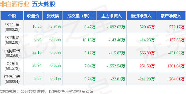 个股表现方面,非白酒行业当日领跌股为*ST兰黄(000929),该股当日报收10.25,下跌2.94%,成交量6.47万,主力资金净流出1092.62万元。*ST椰岛(600238)以下跌0.75%紧随其后,该股当日成交量10.13万,主力资金净流出143.4万元。除此之外,百润股份(002568)、会稽山(601579)、中信尼雅(600084)均进入当日熊股之列。具体个股列表见下表: