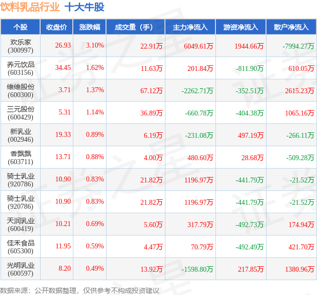 个股表现方面,饮料乳品行业当日领涨股为欢乐家(300997),该股当日报收26.93,上涨3.1%,成交量22.91万,主力资金净流入6049.61万元。养元饮品(603156)以上涨1.62%紧随其后,该股当日成交量11.63万,主力资金净流入201.84万元。除此之外,维维股份(600300)、三元股份(600429)、新乳业(002946)均进入当日牛股之列。具体个股列表见下表: