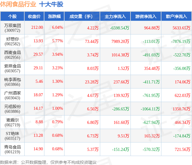 个股表现方面,休闲食品行业当日领涨股为万辰集团(300972),该股当日报收212.0,上涨6.04%,成交量4.22万,主力资金净流出6598.54万元。好想你(002582)以上涨5.77%紧随其后,该股当日成交量73.44万,主力资金净流入7989.2万元。除此之外,西麦食品(002956)、紫燕食品(603057)、桃李面包(603866)均进入当日牛股之列。具体个股列表见下表: