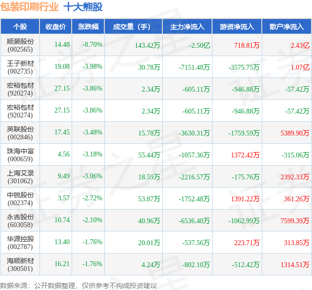 个股表现方面,包装印刷行业当日领跌股为顺灏股份(002565),该股当日报收14.48,下跌8.7%,成交量143.42万,主力资金净流出2.5亿元。王子新材(002735)以下跌3.98%紧随其后,该股当日成交量30.78万,主力资金净流出7151.48万元。除此之外,宏裕包材(920274)、宏裕包材(920274)、英联股份(002846)均进入当日熊股之列。具体个股列表见下表: