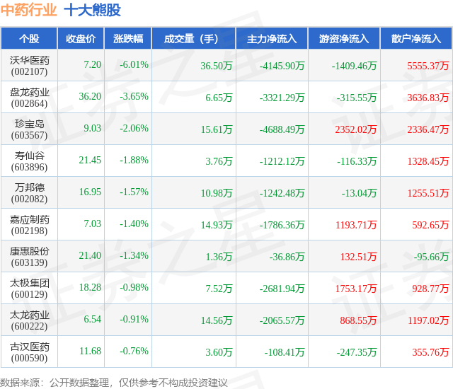 个股表现方面,中药行业当日领跌股为沃华医药(002107),该股当日报收7.2,下跌6.01%,成交量36.5万,主力资金净流出4145.9万元。盘龙药业(002864)以下跌3.65%紧随其后,该股当日成交量6.65万,主力资金净流出3321.29万元。除此之外,珍宝岛(603567)、寿仙谷(603896)、万邦德(002082)均进入当日熊股之列。具体个股列表见下表: