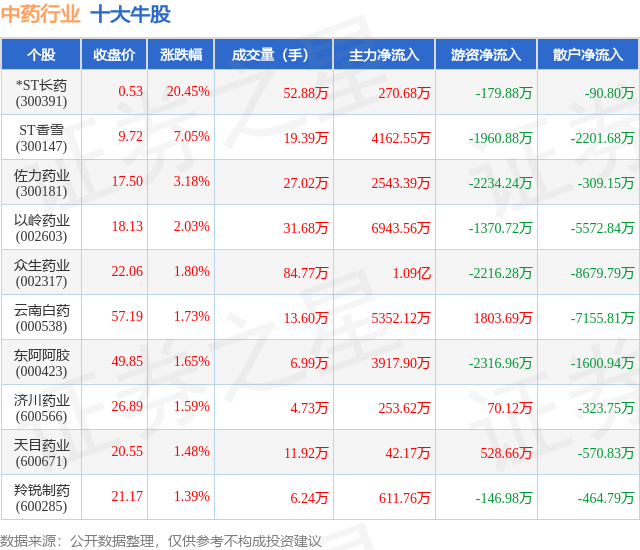 个股表现方面,中药行业当日领涨股为*ST长药(300391),该股当日报收0.53,上涨20.45%,成交量52.88万,主力资金净流入270.68万元。ST香雪(300147)以上涨7.05%紧随其后,该股当日成交量19.39万,主力资金净流入4162.55万元。除此之外,佐力药业(300181)、以岭药业(002603)、众生药业(002317)均进入当日牛股之列。具体个股列表见下表: