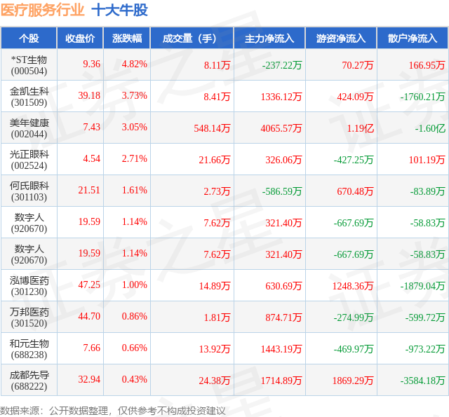 个股表现方面,医疗服务行业当日领涨股为*ST生物(000504),该股当日报收9.36,上涨4.82%,成交量8.11万,主力资金净流出237.22万元。金凯生科(301509)以上涨3.73%紧随其后,该股当日成交量8.41万,主力资金净流入1336.12万元。除此之外,美年健康(002044)、光正眼科(002524)、何氏眼科(301103)均进入当日牛股之列。具体个股列表见下表: