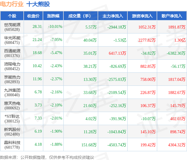 个股表现方面,电力行业当日领跌股为世茂能源(605028),该股当日报收28.31,下跌10.01%,成交量5.57万,主力资金净流出2944.18万元。华光环能(600475)以下跌7.05%紧随其后,该股当日成交量40.04万,主力资金净流出1.53亿元。除此之外,百通能源(001376)、涪陵电力(600452)、京能热力(002893)均进入当日熊股之列。具体个股列表见下表: