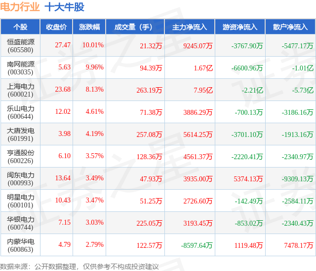 个股表现方面,电力行业当日领涨股为恒盛能源(605580),该股当日报收27.47,上涨10.01%,成交量21.32万,主力资金净流入9245.07万元。南网能源(003035)以上涨9.96%紧随其后,该股当日成交量94.39万,主力资金净流入1.67亿元。除此之外,上海电力(600021)、乐山电力(600644)、大唐发电(601991)均进入当日牛股之列。具体个股列表见下表: