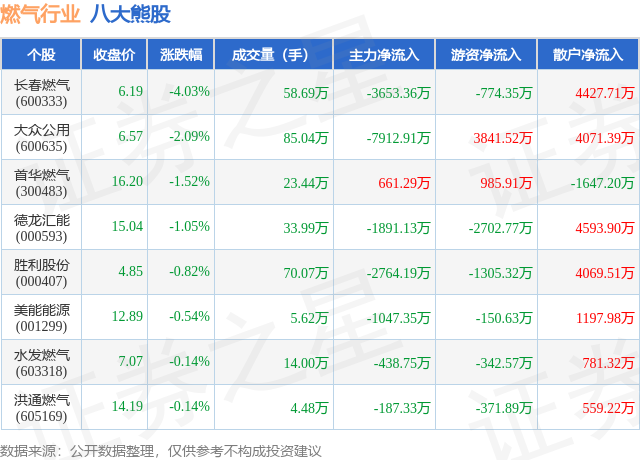 个股表现方面,燃气行业当日领跌股为长春燃气(600333),该股当日报收6.19,下跌4.03%,成交量58.69万,主力资金净流出3653.36万元。大众公用(600635)以下跌2.09%紧随其后,该股当日成交量85.04万,主力资金净流出7912.91万元。除此之外,首华燃气(300483)、德龙汇能(000593)、胜利股份(000407)均进入当日熊股之列。具体个股列表见下表: