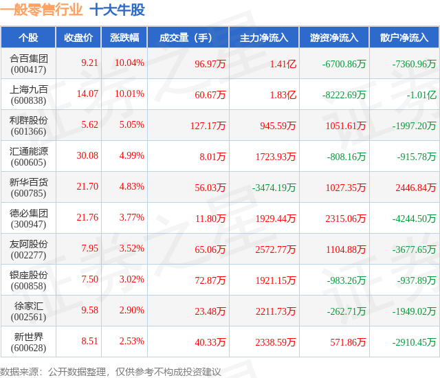 个股表现方面,一般零售行业当日领涨股为合百集团(000417),该股当日报收9.21,上涨10.04%,成交量96.97万,主力资金净流入1.41亿元。上海九百(600838)以上涨10.01%紧随其后,该股当日成交量60.67万,主力资金净流入1.83亿元。除此之外,利群股份(601366)、汇通能源(600605)、新华百货(600785)均进入当日牛股之列。具体个股列表见下表: