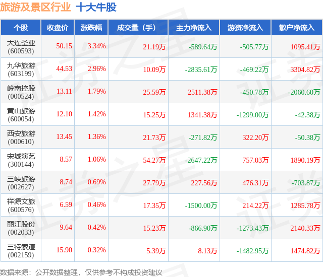个股表现方面,旅游及景区行业当日领涨股为大连圣亚(600593),该股当日报收50.15,上涨3.34%,成交量21.19万,主力资金净流出589.64万元。九华旅游(603199)以上涨2.96%紧随其后,该股当日成交量10.09万,主力资金净流出2835.61万元。除此之外,岭南控股(000524)、黄山旅游(600054)、西安旅游(000610)均进入当日牛股之列。具体个股列表见下表: