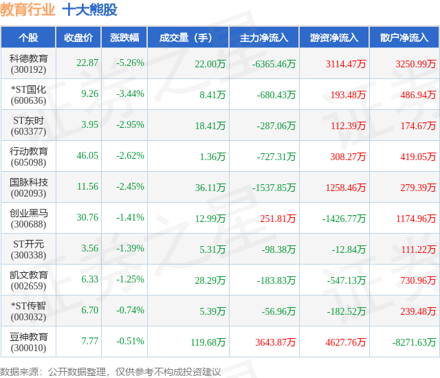 个股表现方面,教育行业当日领跌股为科德教育(300192),该股当日报收22.87,下跌5.26%,成交量22.0万,主力资金净流出6365.46万元。*ST国化(600636)以下跌3.44%紧随其后,该股当日成交量8.41万,主力资金净流出680.43万元。除此之外,ST东时(603377)、行动教育(605098)、国脉科技(002093)均进入当日熊股之列。具体个股列表见下表: