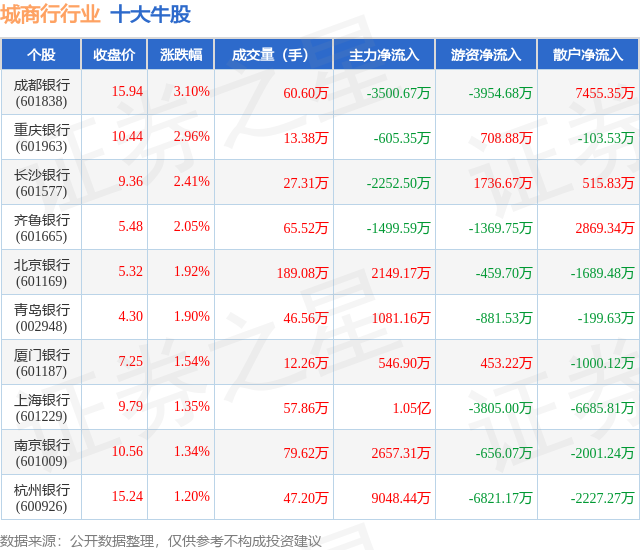 个股表现方面,城商行行业当日领涨股为成都银行(601838),该股当日报收15.94,上涨3.1%,成交量60.6万,主力资金净流出3500.67万元。重庆银行(601963)以上涨2.96%紧随其后,该股当日成交量13.38万,主力资金净流出605.35万元。除此之外,长沙银行(601577)、齐鲁银行(601665)、北京银行(601169)均进入当日牛股之列。具体个股列表见下表:
