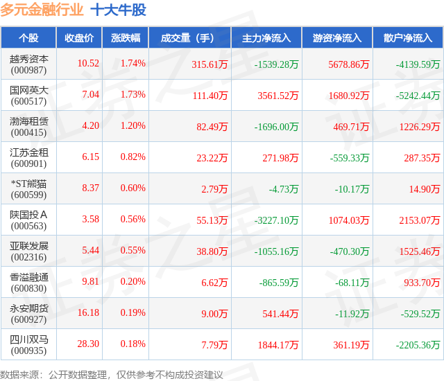 个股表现方面,多元金融行业当日领涨股为越秀资本(000987),该股当日报收10.52,上涨1.74%,成交量315.61万,主力资金净流出1539.28万元。国网英大(600517)以上涨1.73%紧随其后,该股当日成交量111.4万,主力资金净流入3561.52万元。除此之外,渤海租赁(000415)、江苏金租(600901)、*ST熊猫(600599)均进入当日牛股之列。具体个股列表见下表: