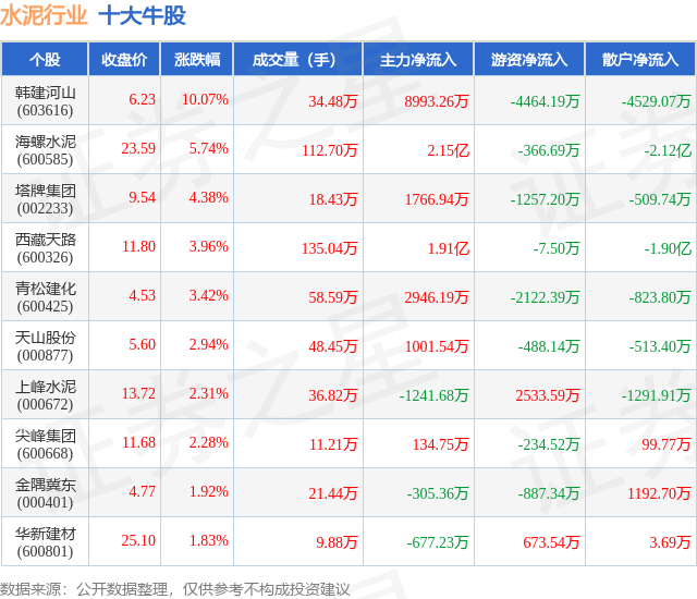 个股表现方面,水泥行业当日领涨股为韩建河山(603616),该股当日报收6.23,上涨10.07%,成交量34.48万,主力资金净流入8993.26万元。海螺水泥(600585)以上涨5.74%紧随其后,该股当日成交量112.7万,主力资金净流入2.15亿元。除此之外,塔牌集团(002233)、西藏天路(600326)、青松建化(600425)均进入当日牛股之列。具体个股列表见下表: