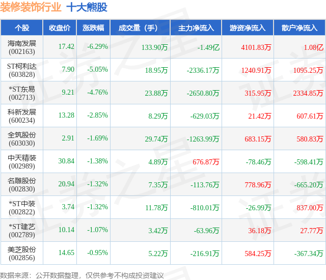 个股表现方面,装修装饰行业当日领跌股为海南发展(002163),该股当日报收17.42,下跌6.29%,成交量133.9万,主力资金净流出1.49亿元。ST柯利达(603828)以下跌5.05%紧随其后,该股当日成交量18.95万,主力资金净流出2336.17万元。除此之外,*ST东易(002713)、科新发展(600234)、全筑股份(603030)均进入当日熊股之列。具体个股列表见下表: