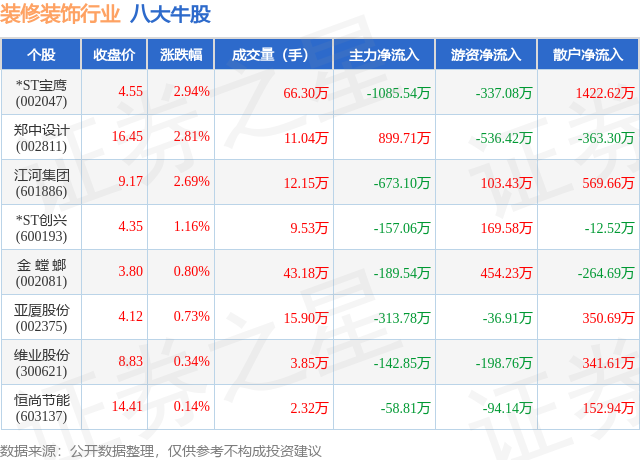 个股表现方面,装修装饰行业当日领涨股为*ST宝鹰(002047),该股当日报收4.55,上涨2.94%,成交量66.3万,主力资金净流出1085.54万元。郑中设计(002811)以上涨2.81%紧随其后,该股当日成交量11.04万,主力资金净流入899.71万元。除此之外,江河集团(601886)、*ST创兴(600193)、金 螳 螂(002081)均进入当日牛股之列。具体个股列表见下表: