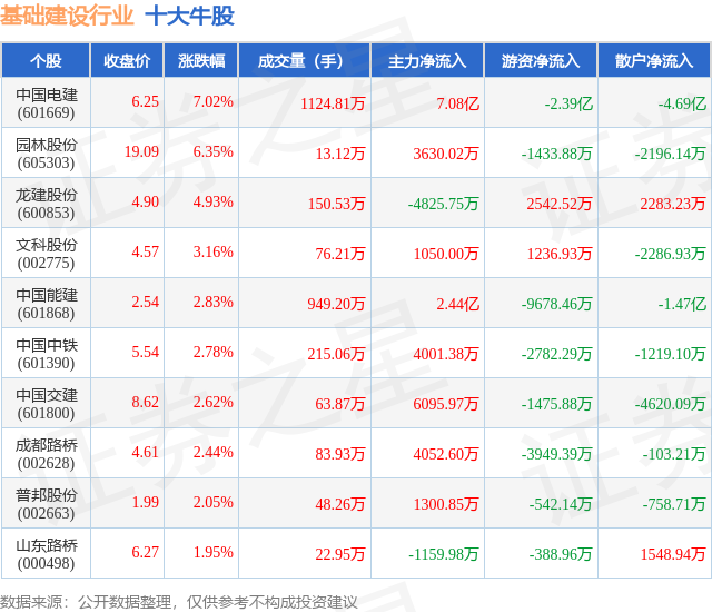 个股表现方面,基础建设行业当日领涨股为中国电建(601669),该股当日报收6.25,上涨7.02%,成交量1124.81万,主力资金净流入7.08亿元。园林股份(605303)以上涨6.35%紧随其后,该股当日成交量13.12万,主力资金净流入3630.02万元。除此之外,龙建股份(600853)、文科股份(002775)、中国能建(601868)均进入当日牛股之列。具体个股列表见下表: