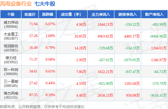 个股表现方面,风电设备行业当日领涨股为威力传动(300904),该股当日报收71.94,上涨6.07%,成交量4.96万,主力资金净流入1044.21万元。大金重工(002487)以上涨1.6%紧随其后,该股当日成交量20.85万,主力资金净流入4963.81万元。除此之外,恒润股份(603985)、德力佳(603092)、双一科技(300690)均进入当日牛股之列。具体个股列表见下表: