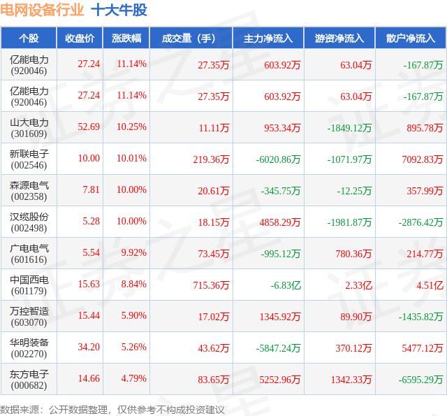 个股表现方面,电网设备行业当日领涨股为亿能电力(920046),该股当日报收27.24,上涨11.14%,成交量27.35万,主力资金净流入603.92万元。亿能电力(920046)以上涨11.14%紧随其后,该股当日成交量27.35万,主力资金净流入603.92万元。除此之外,山大电力(301609)、新联电子(002546)、森源电气(002358)均进入当日牛股之列。具体个股列表见下表: