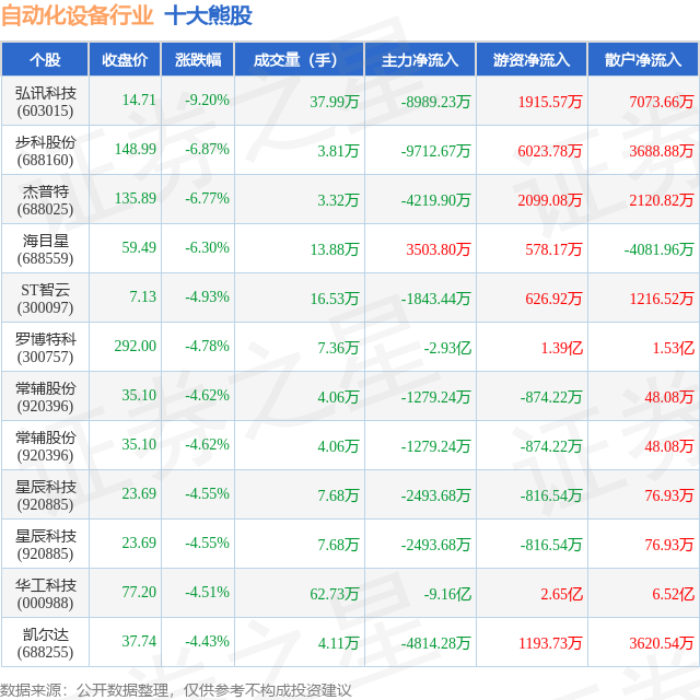 个股表现方面,自动化设备行业当日领跌股为弘讯科技(603015),该股当日报收14.71,下跌9.2%,成交量37.99万,主力资金净流出8989.23万元。步科股份(688160)以下跌6.87%紧随其后,该股当日成交量3.81万,主力资金净流出9712.67万元。除此之外,杰普特(688025)、海目星(688559)、ST智云(300097)均进入当日熊股之列。具体个股列表见下表:
