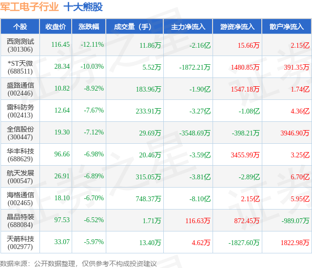 个股表现方面,军工电子行业当日领跌股为西测测试(301306),该股当日报收116.45,下跌12.11%,成交量11.86万,主力资金净流出2.16亿元。*ST天微(688511)以下跌10.03%紧随其后,该股当日成交量5.52万,主力资金净流出1872.21万元。除此之外,盛路通信(002446)、雷科防务(002413)、全信股份(300447)均进入当日熊股之列。具体个股列表见下表: