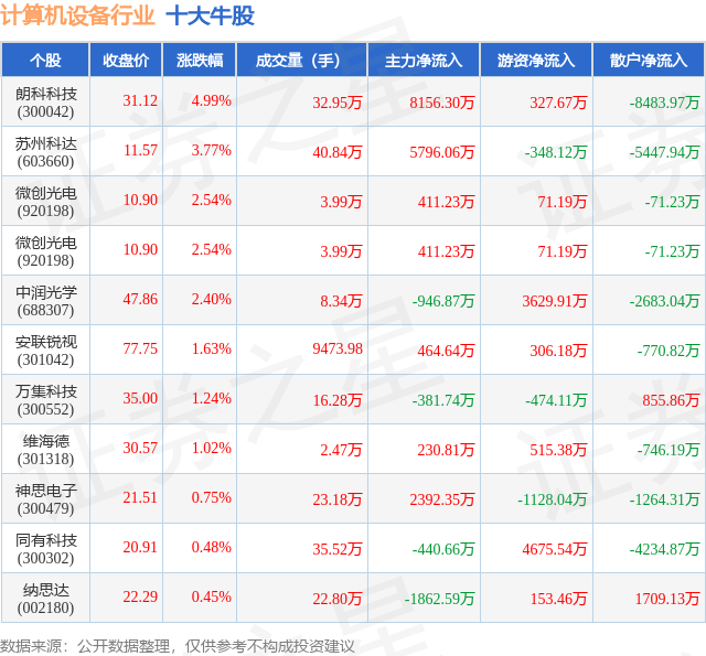 个股表现方面,计算机设备行业当日领涨股为朗科科技(300042),该股当日报收31.12,上涨4.99%,成交量32.95万,主力资金净流入8156.3万元。苏州科达(603660)以上涨3.77%紧随其后,该股当日成交量40.84万,主力资金净流入5796.06万元。除此之外,微创光电(920198)、微创光电(920198)、中润光学(688307)均进入当日牛股之列。具体个股列表见下表: