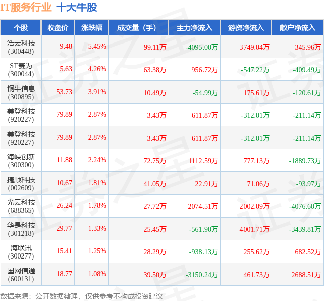 个股表现方面,IT服务行业当日领涨股为浩云科技(300448),该股当日报收9.48,上涨5.45%,成交量99.11万,主力资金净流出4095.0万元。ST赛为(300044)以上涨4.26%紧随其后,该股当日成交量63.38万,主力资金净流入956.72万元。除此之外,铜牛信息(300895)、美登科技(920227)、美登科技(920227)均进入当日牛股之列。具体个股列表见下表: