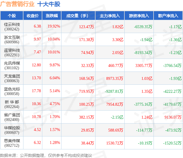 个股表现方面,广告营销行业当日领涨股为佳云科技(300242),该股当日报收6.38,上涨19.92%,成交量123.47万,主力资金净流入1.82亿元。浙文互联(600986)以上涨10.04%紧随其后,该股当日成交量171.38万,主力资金净流入3.3亿元。除此之外,遥望科技(002291)、兆讯传媒(301102)、天龙集团(300063)均进入当日牛股之列。具体个股列表见下表:
