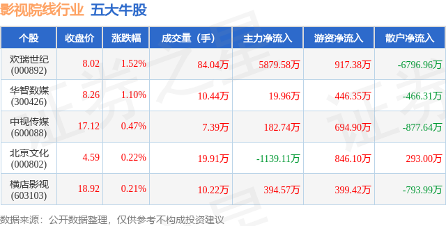 个股表现方面,影视院线行业当日领涨股为欢瑞世纪(000892),该股当日报收8.02,上涨1.52%,成交量84.04万,主力资金净流入5879.58万元。华智数媒(300426)以上涨1.1%紧随其后,该股当日成交量10.44万,主力资金净流入19.96万元。除此之外,中视传媒(600088)、北京文化(000802)、横店影视(603103)均进入当日牛股之列。具体个股列表见下表: