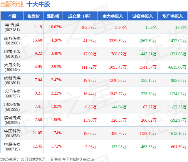 个股表现方面,出版行业当日领涨股为粤 传 媒(002181),该股当日报收11.19,上涨10.03%,成交量102.39万,主力资金净流入3.2亿元。南方传媒(601900)以上涨4.28%紧随其后,该股当日成交量41.26万,主力资金净流入3339.39万元。除此之外,山东出版(601019)、天舟文化(300148)、皖新传媒(601801)均进入当日牛股之列。具体个股列表见下表: