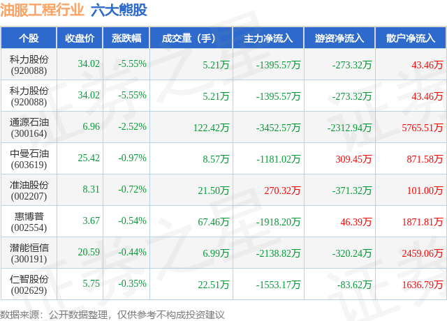 个股表现方面,油服工程行业当日领跌股为科力股份(920088),该股当日报收34.02,下跌5.55%,成交量5.21万,主力资金净流出1395.57万元。科力股份(920088)以下跌5.55%紧随其后,该股当日成交量5.21万,主力资金净流出1395.57万元。除此之外,通源石油(300164)、中曼石油(603619)、准油股份(002207)均进入当日熊股之列。具体个股列表见下表: